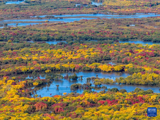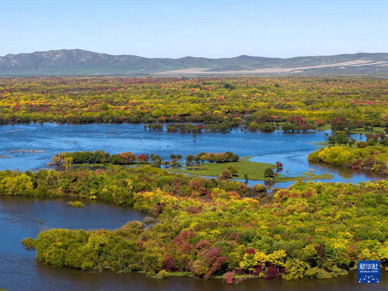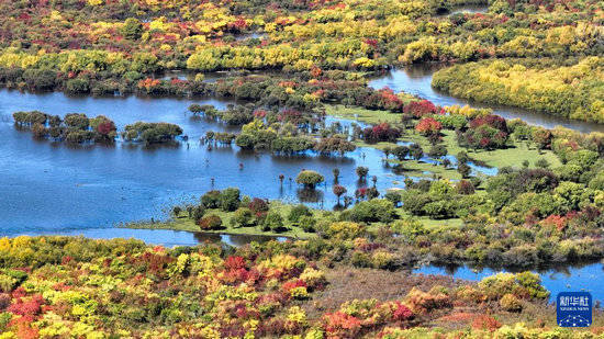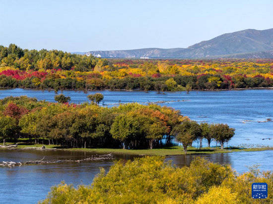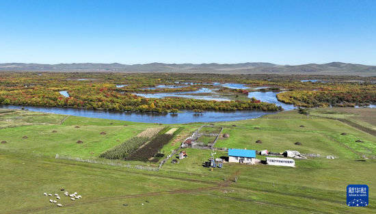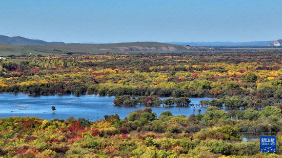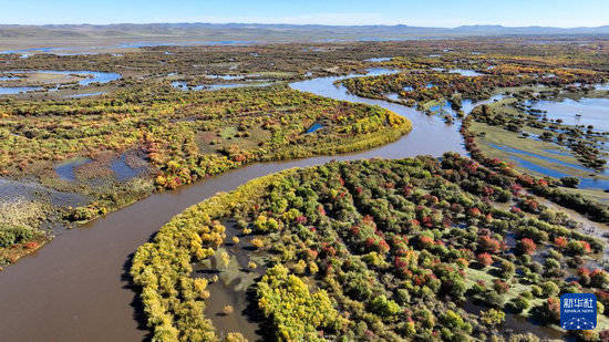 r时下,内蒙古额尔古纳湿地迎来秋日盛景,多彩的灌木丛点缀其间,蜿蜒的河流如蓝丝带般静静流淌,宛若大自然打翻的调色盘。